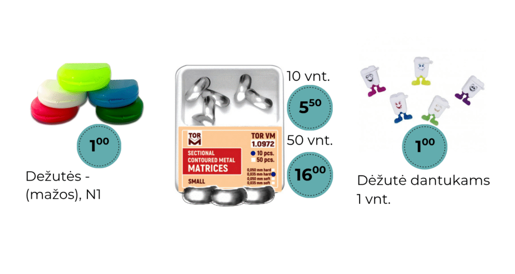 Šiame trumpame leidinyje pristatome tik dalį mūsų tiekiamų odontologinių medžiagų ir priemonių. Čia rasite informaciją apie higienines priemones, matricas, poliravimo diskus ar net žaislus mažiesiems.